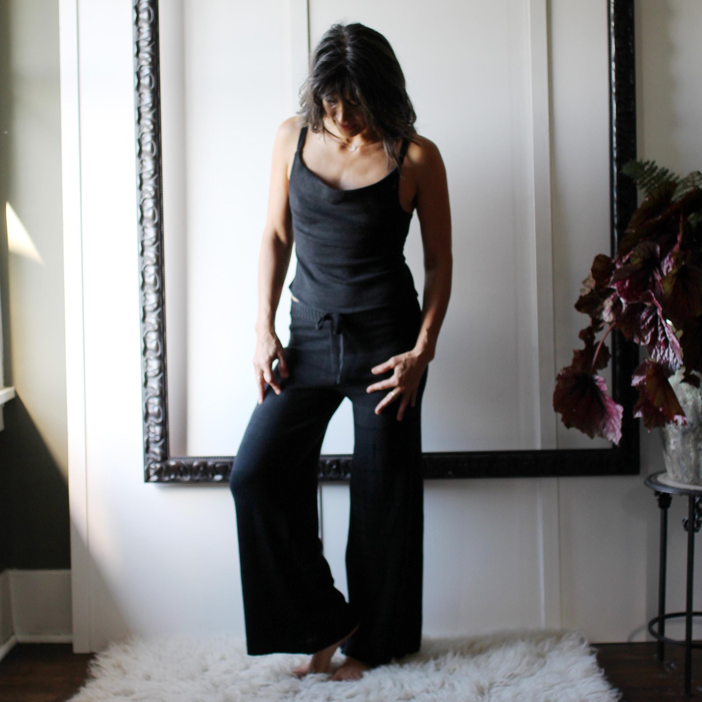 Includes the draped neck camisole and the wide leg pants with a drawstring waist