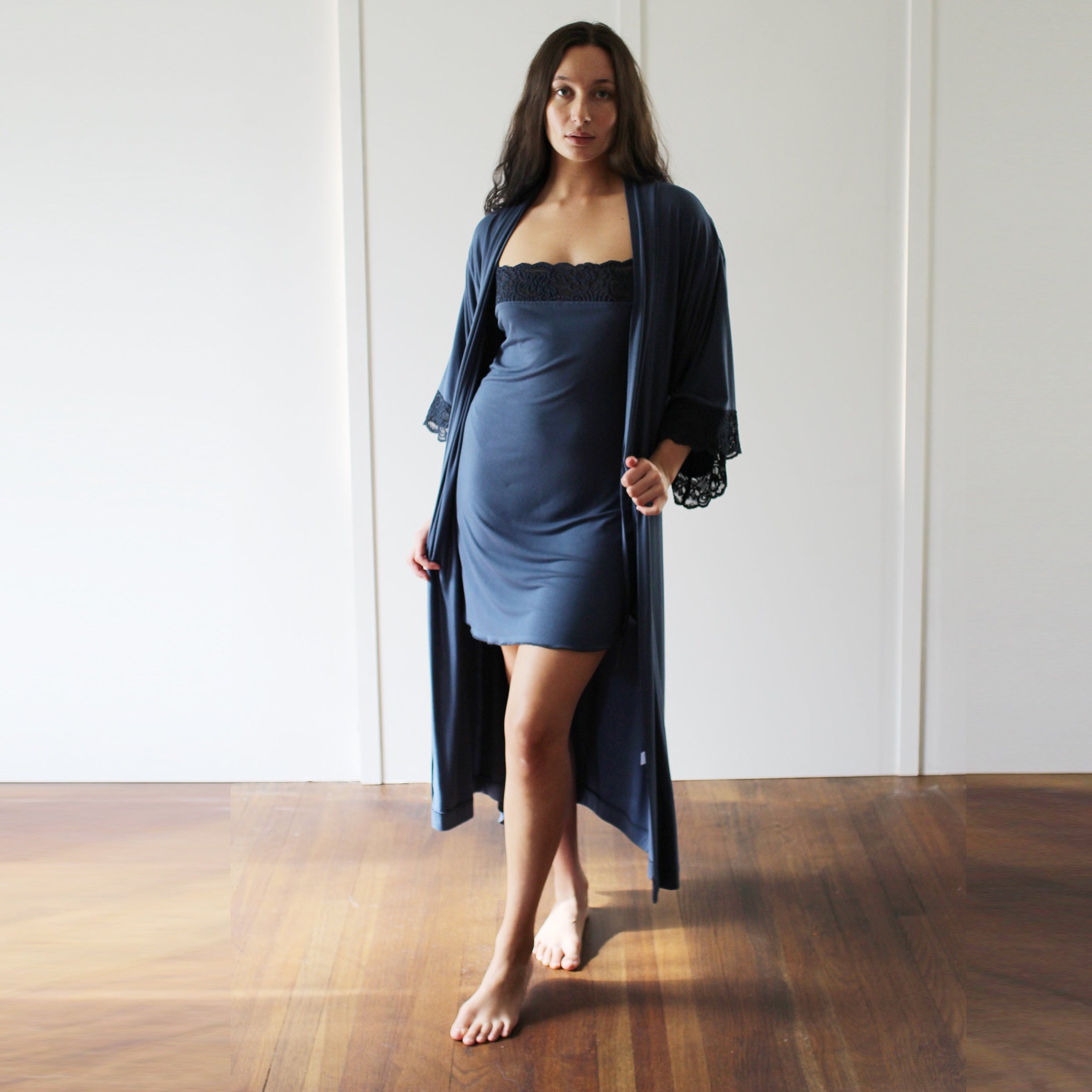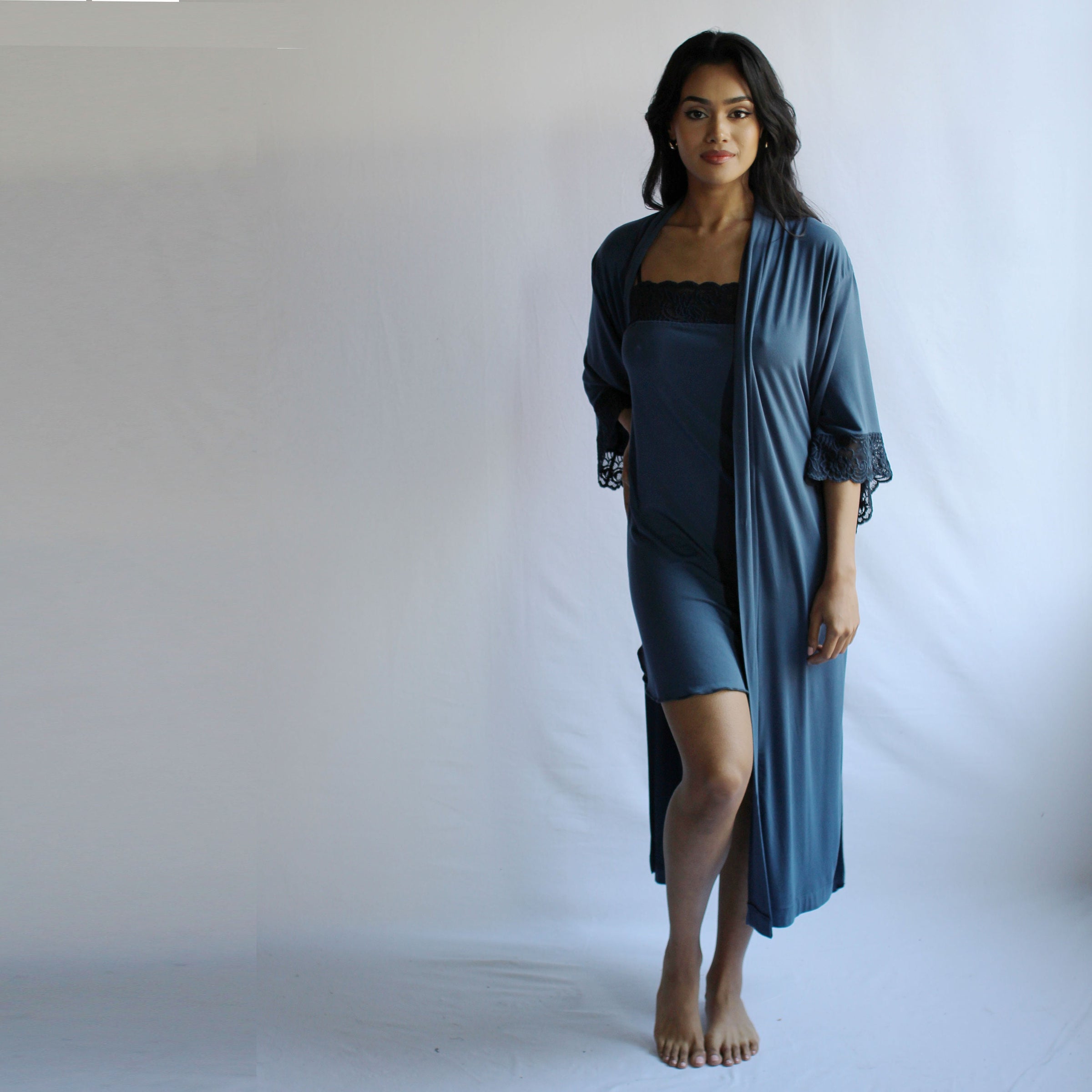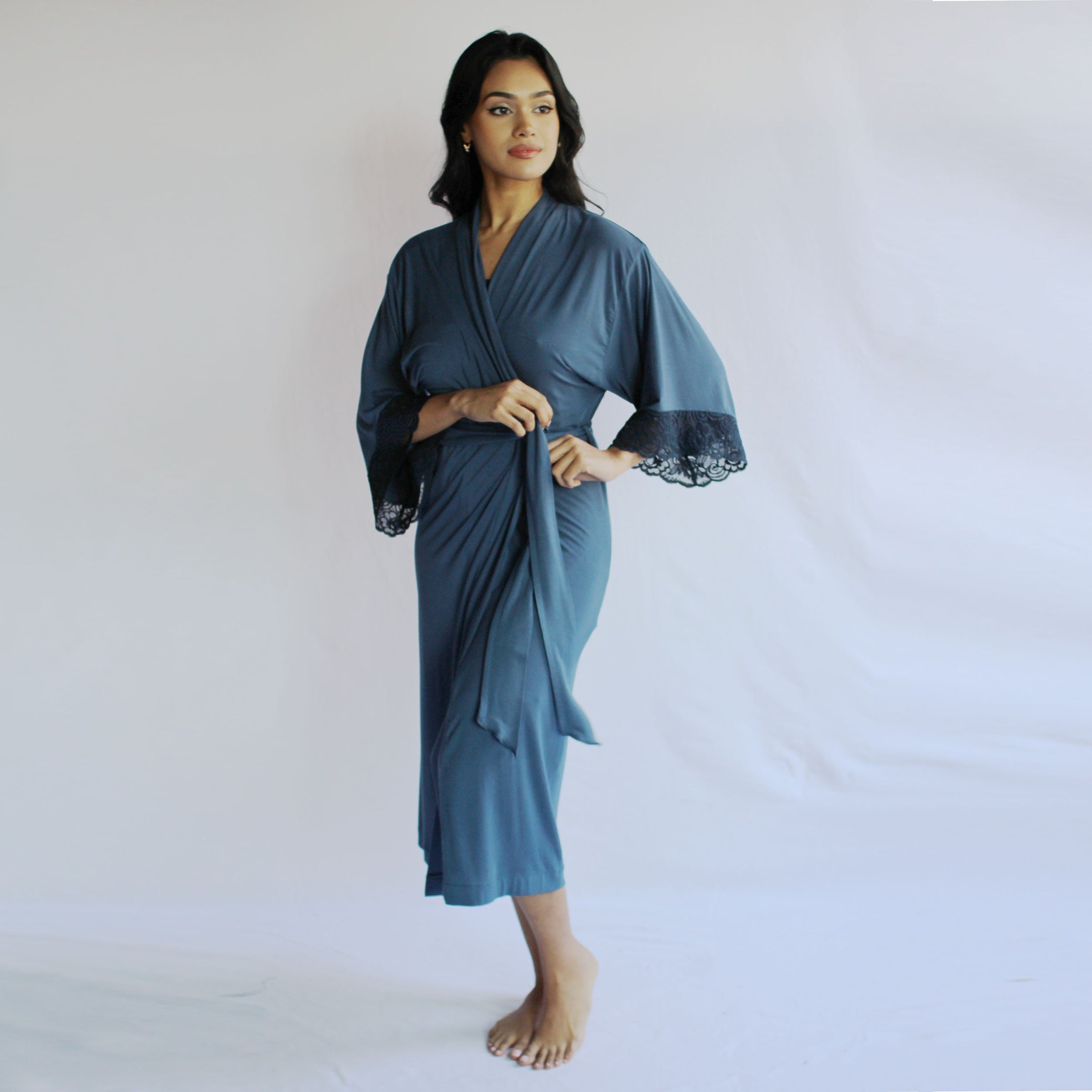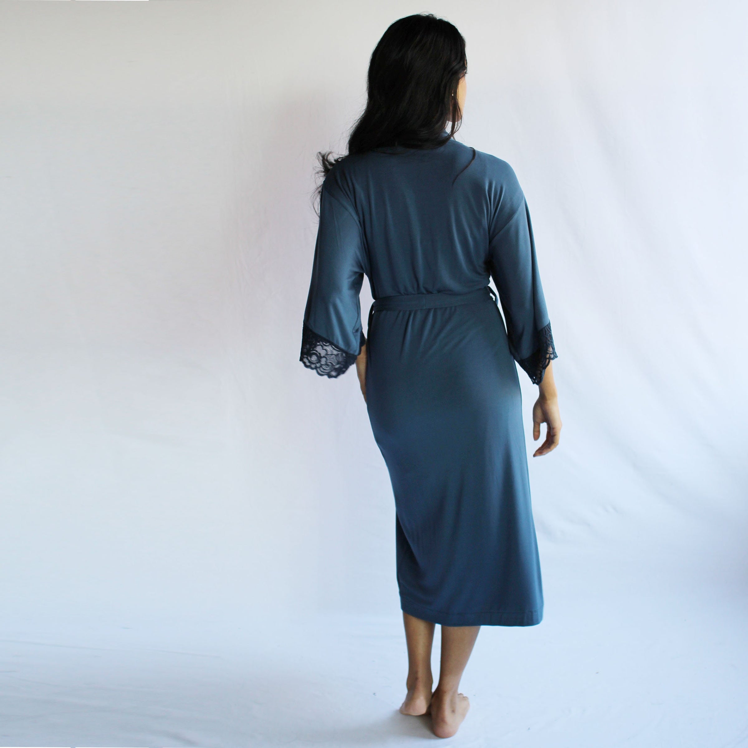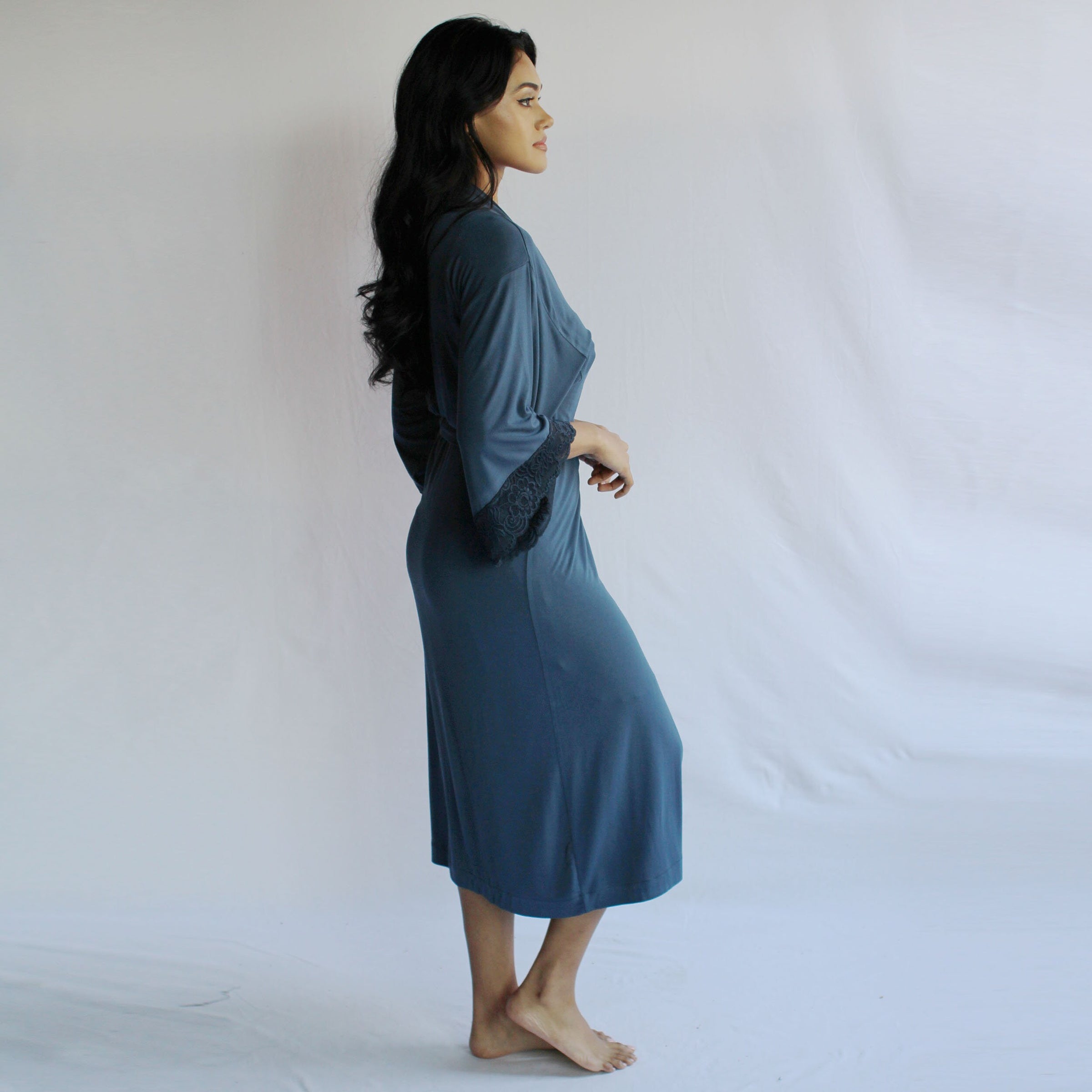 A midi length kimono sleeve robe in soft bamboo jersey with a Lace Cuff
